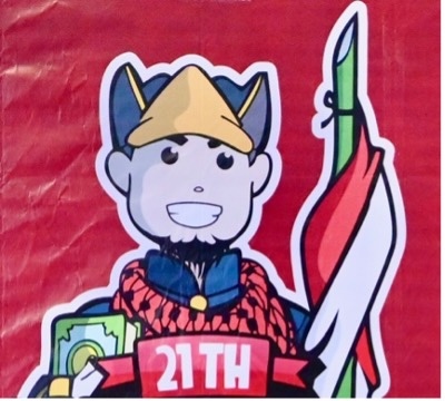 The Kampung Ramadan logo is symbolically dense. It includes six comments symbolising Islam, Indonesian nationalism and Yogyakarta tradition: a bearded man (some Indonesians associate beards with Muslim piety) wearing the tunic of the sort worn by Yogyakarta palace officials and a sorban (prayer shawl) associated with traditional Indonesian Islam. He holds a Qur’an in one hand and an Indonesian flag attached to a bamboo spear symbolising the nation’s revolutionary struggle in the other.
