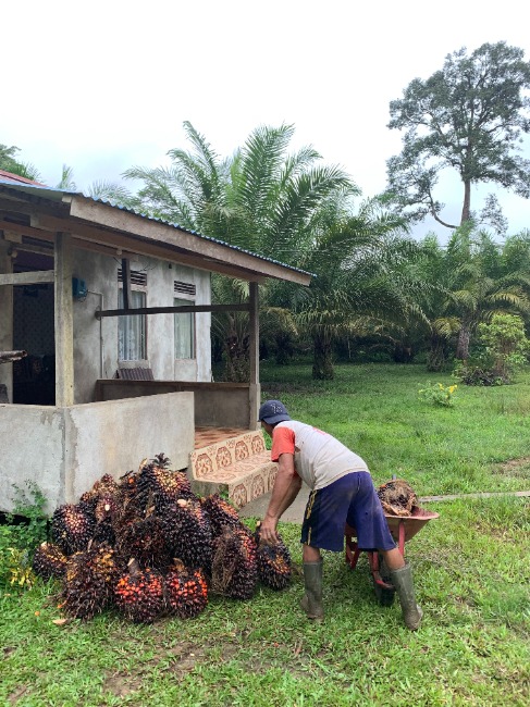 A Benawan man stacking oil palm fruits from the plantation by a house. They lack knowledge about how oil palm cultivation destroys their forests.