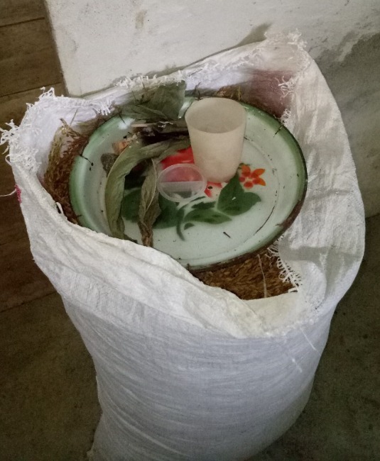 “Feeding the new rice" (mpara pade uman). Newly harvested rice from their fields will be stored in sacks. They “feed” it by placing offerings such as steamed rice (freshly cooked from the top layer), water, liquor (arak), and umpak (consisting of betel leaves, slaked lime, and gamber).